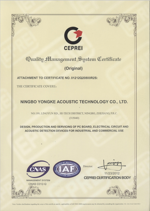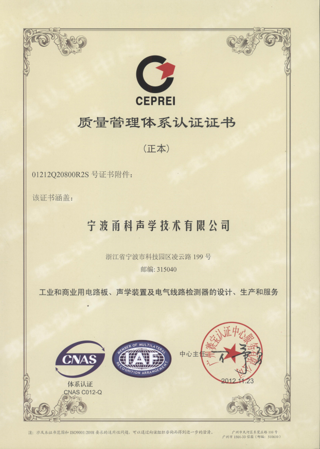 宁波甬科声学技术有限公司继续一如既往潜心打造自身品牌,不断提高企业管理运作水平,积极配合客户所需,继续领行业之新,标行业之异。公司成功导入ISO9000:2008质量管理体系及ERP管理系统,把质量保证体系覆盖到从产品定项研发、试产及原材料采购、生产、调试、成品检验及销售和售后服务中。产品通过各个权威部门认证,并严格贯彻相关的质量管理标准,为广大的客户提供优质的产品和服务。